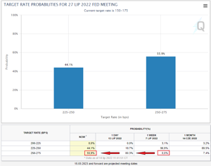 W tej sytuacji pojawiły się słuszne obawy o to, że Fed zdecyduje się na podwyżkę aż o 100pb na posiedzeniu lipcowym. Taki wyskok inflacji oddala też szansę na złagodzenie retoryki Fedu na jesień. Od środy pojawiły się bardzo mocne wahania zmian prawdopodobieństwa kolejnego ruchu, co możemy zobaczyć na poniższej grafice FedWatch Tool ze strony CME Group.